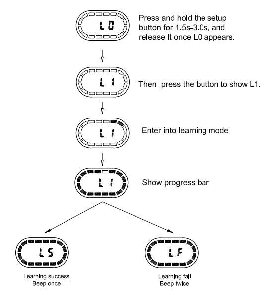c.Constantly press the setup button for 1.5s-3s, the buzzer will beep once, the display will show “LO”, and enter into the automatic learning function setup mode; Release the button, and then briefly press the key to make the display shows “L1”, the system enters into the automatic learning mode, and the learning results are shown after the learning process is completed. If “LS” is shown and beeps once, the learning is successful; if “LF” is shown and beeps twice, the learning is failed.