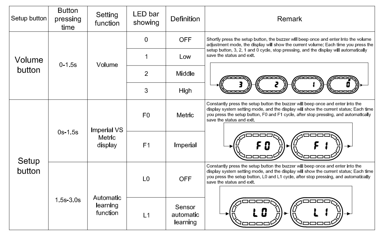 c.Constantly press the setup button for 1.5s-3s, the buzzer will beep once, the display will show “LO”, and enter into the automatic learning function setup mode; Release the button, and then briefly press the key to make the display shows “L1”, the system enters into the automatic learning mode, and the learning results are shown after the learning process is completed. If “LS” is shown and beeps once, the learning is successful; if “LF” is shown and beeps twice, the learning is failed.