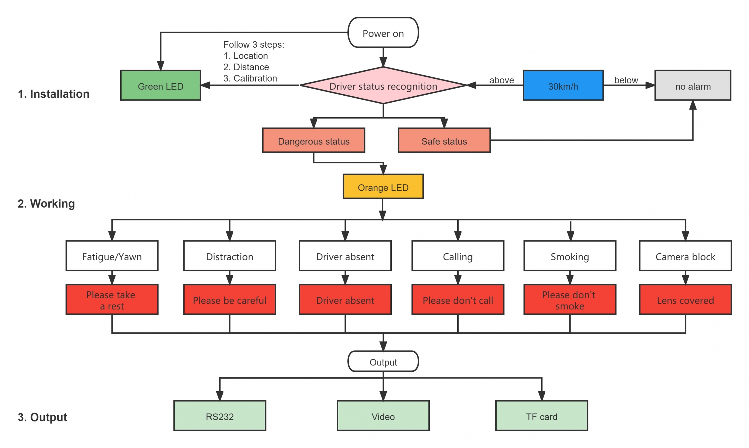 The alarm will be made when the driver is not on the seat or the camera be covered.